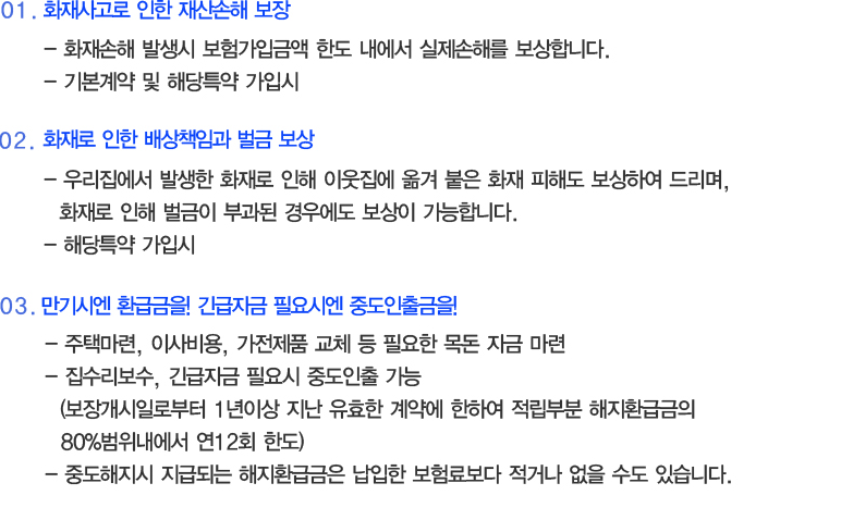 ÈÀ纸ÇèÀº °Ç¹°¿¡´ëÇÑ ¼ÕÇØ»Ó¸¸¾Æ´Ï¶ó ÁÖÅó» °¡ÀüÁ¦Ç°µî °¡Àç¼ÕÇØ, ÈÀç󸮺ñ¿ë,ÀÌ»çºñ¿ë,°µµ·ÎÀÎÇÑ µµ³¼ÕÇØ µîÀ» º¸ÀåÇØµå¸®¸ç ÀÌ¿ôÁý¿¡ ¹øÁ³À»°æ¿ìµµ ´ë¹° ÇÑ»ç°í´ç º¸Çè»çº°·Î 5¾ï~ÃÖ´ë10¾ï¿øÇѵµ, ´ëÀÎ ÇѸí´ç1¾ï¿ø Çѵµ³»¿¡¼ º¸ÀåÇØµå¸³´Ï´Ù. ¶ÇÇÑ ÈÀç»ç°í ½Ã ¹ú±ÝÀ» ÀϹݰú½Ç 1500¸¸¿ø, Áß°ú½Ç 2000¸¸¿ø Á¤µµ ³³ºÎÇØ¾ßÇϱ⠶§¹®¿¡ ¹ú±Ý´ãº¸µµ ²À °¡ÀÔÇÏ¼Å¾ß ÇÕ´Ï´Ù.