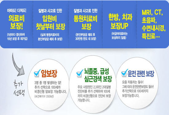 ¡Ø ÀÇ·á½Çºñº¸Çè °¡ÀԽà ÇÊ¿äÇÑ ºÎºÐÀ» ¼±ÅÃÇÏ½Ã¸é ¸ÂÃã¼³°è °¡´ÉÇØ¿ä -> ÇϳªÀÇ º¸ÇèÀ¸·Î Áúº´, »ç°í, ¿îÀüÀÚ±îÁö Ư¾à°¡ÀԽà Çѹø¿¡ º¸Àå!!! -> Çѹ溴¿ø, Ä¡°úÄ¡·á, Ç×¹®°ü·ÃÁúȯºÎºÐ º¸Àå(±¹¹Î°Ç°º¸Çè ±Þ¿©ºÎ¹® Çѵµ) -> Áúº´°ú »óÇØ Ä¡·á¸¦ À§ÇÑ °Ë»çºñ(MRI,CT,X-RAY,³»½Ã°æ,ÃÊÀ½ÆÄµî) -> ¾Ï, ³úÁ¹Áß, ±Þ¼º½É±Ù°æ»öÁø´Üºñ º¸Àå -> ¿îÀüÀÚ Æ¯¾à °È µû·Î ¿îÀüÀÚ¸¦ °¡ÀÔÇÒ Çʿ䰡 ¾ø´Â ¿îÀüÀÚ Æ¯¾àµéÀ» ¼±Åà °¡´É (¹ú±Ý, ¹æ¾îºñ¿ë, ±³Åë»ç°íó¸®Áö¿ø±Ý´ãº¸)