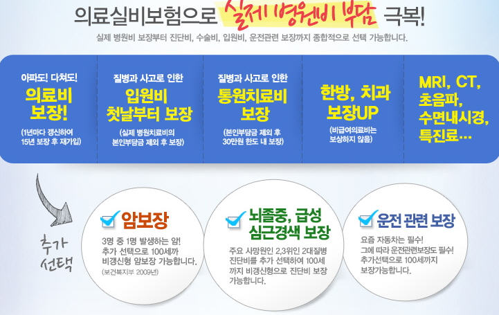 ÀÇ·á½Çºñº¸ÇèÀ̶õ ? °¨±â°°Àº ÀÛÀº Áúº´ºÎÅÍ ¾Ï,³úÁ¹Áõ,¼ºÀÎÁúº´µî Áß´ëÁúº´ºÎÅÍ ¼Ò¼ÒÇÑ Áúº´°ú ¿¹±âÄ¡¾ÊÀº ÀÏ¹Ý »óÇØ»ç°í±îÁö ½Çºñ·Î º¸ÀåµÇ´Â º¸ÇèÀÔ´Ï´Ù. ºñ±Þ¿© ´ë»óÀÎ MRI,CT,Ư¼ö°Ë»çµîÀÇ °í°¡ÀÇ °Ë»çºñ¿ëµµ 40%º¸Àå(Çѹæ,Ä¡°ú,Ç×¹®ÁúȯÀº ºñ±Þ¾îÁ¦¿Ü) ¼ºº´,¿ä·Î°¨¿°,¿ä½Ç±Ý,¼±ÃµÀûÁúȯµîÀ» Á¦¿ÜÇÑ ³ª¸ÓÁö º»Àκδã±ÝÀ» ÀÔ¿ø½Ã 90%º¸Àå Åë¿ø½Ã ¿Ü·¡ 1-2¸¸¿ø°øÁ¦ÈÄ 25¸¸¿øÇѵµ ó¹æ1°Ç´ç 8õ¿ø°øÁ¦ÈÄ 5¸¸¿øÇѵµ·Î º¸ÀåµË´Ï´Ù.