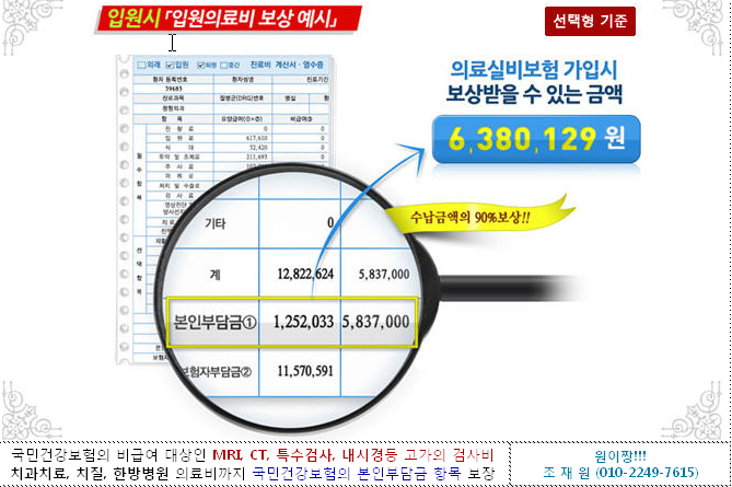 ÀÏ´Ü ÀÇ·á½Çºñ¶ó ÇÔÀº ÀÇ·á½Çºñ º¸ÇèÀº ¿¹±âÄ¡ ¸øÇÑ Áúº´, »óÇØ·Î ÀÎÇÑ º´¿øºñ ÇýÅÃÀ» ¹Þ´Â º¸ÇèÀ¸·Î MRI, CT, ³»½Ã°æ, ÃÊÀ½ÆÄ µî Ä¡·á¸ñÀûÀÇ °Ë»çºñ´Â ¹°·Ð ¿ø¹«°ú¿¡ ³»´Â º´¿øºñ¸¦ µ¹·Á¹Þ´Â º¸ÇèÀ¸·Î °Ç°ÇÒ¶§ ÇʼöÀûÀ¸·Î °¡ÀÔÇÏ¼Å¾ß ÇÕ´Ï´Ù.